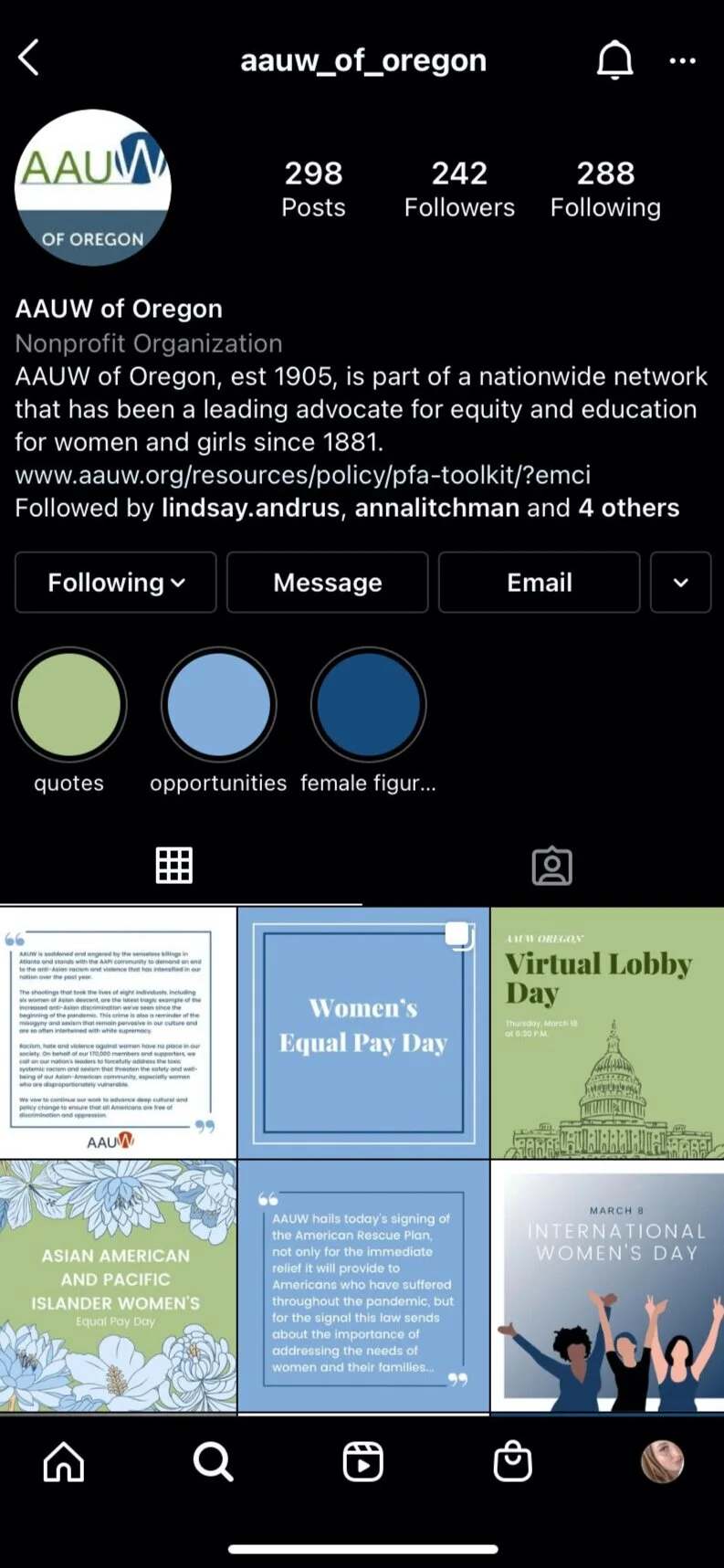 Effectively and efficiently communicate AAUW brand through social media platforms (Instagram, Facebook and LinkedIn), as well as official state website.